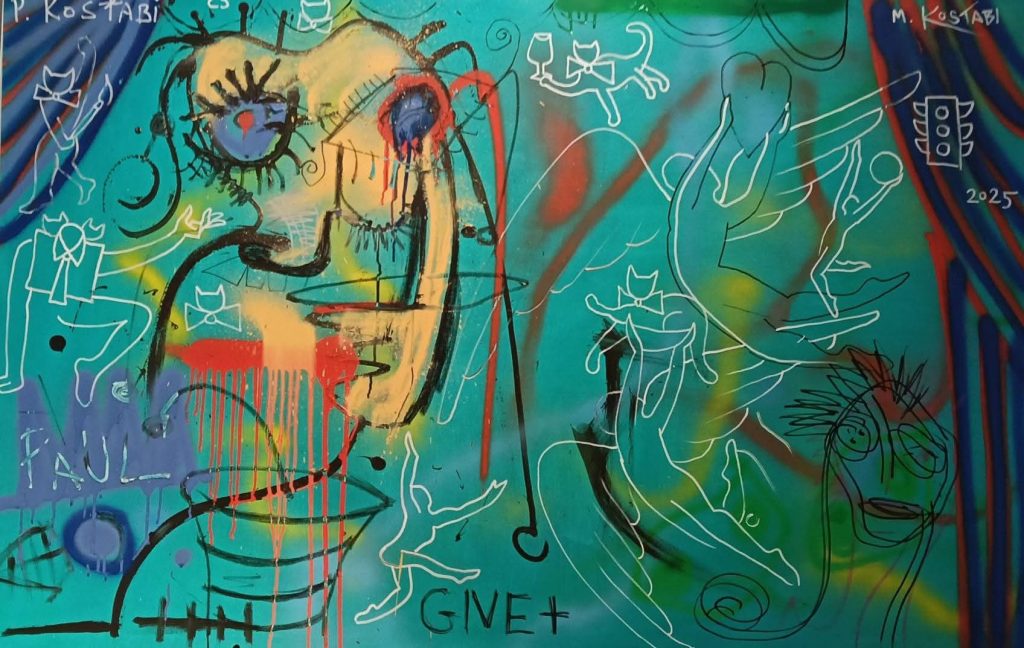 Kostabi si trasferisce a New York nel 1982 e nel 1984, emerge quale una figura di spicco nella scena artistica dell’East Village dove sviluppa la sua provocatoria personalità, attraverso l’uso dei media con auto-interviste che riflettono sulla mercificazione dell’arte contemporanea.