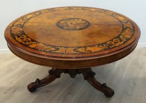 Pregiato tavolo francese in noce, radica di noce, palissandro, intarsio bois de rose. Meccanismo di apertura a vela originale.